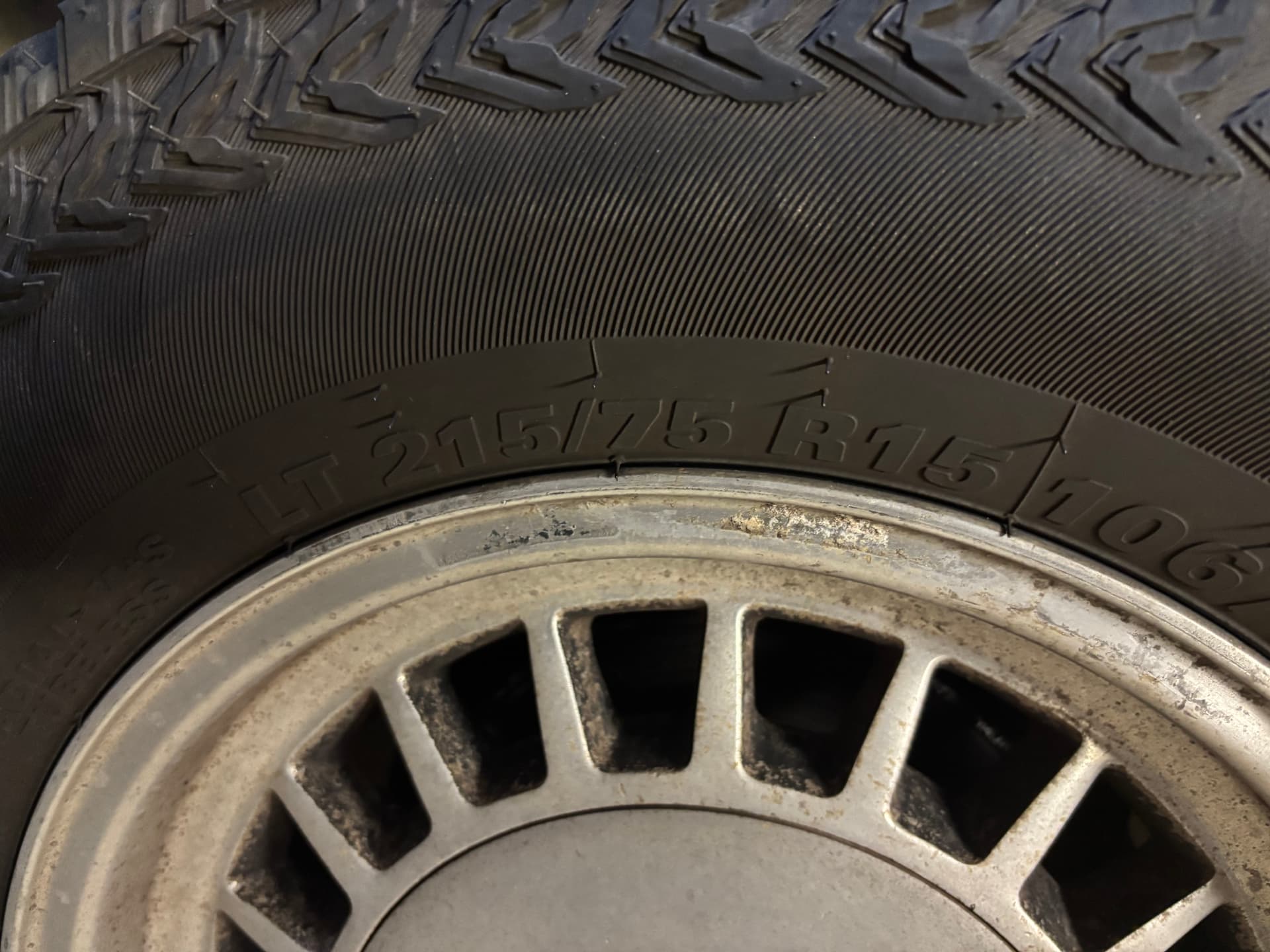 Goodyear Wrangler ATS; 225/75R15 108Q 733mm (too large for spare-wheel well).